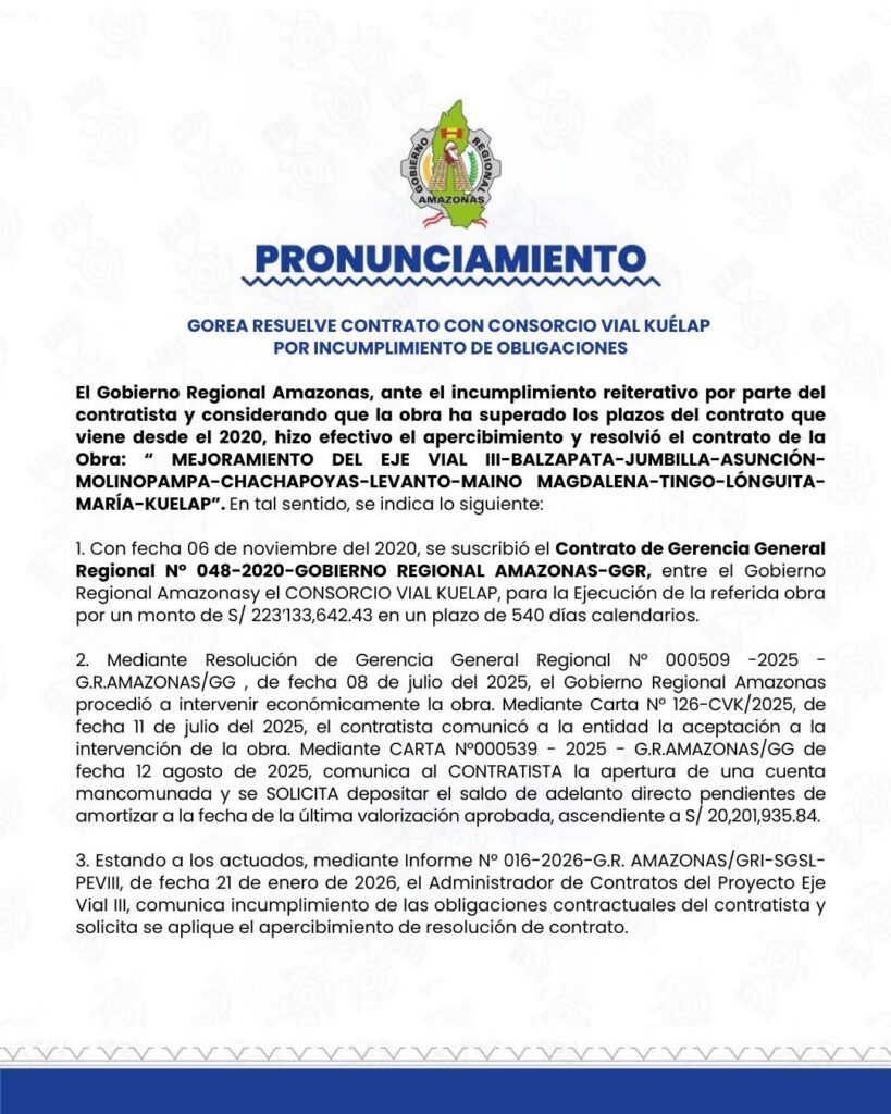 Las denuncias descritas no pueden quedar en el terreno del discurso político ni de la confrontación mediática, menos con un comunicado, que cual Pilatos, es una lavada de manos de esta gestión corrupta. La magnitud de los montos involucrados, la reiteración de observaciones y el impacto directo en servicios esenciales —salud e infraestructura vial— obligan a los órganos de control a actuar con celeridad y firmeza. La fiscalización efectiva no es una opción: es una responsabilidad ineludible frente a la ciudadanía de Amazonas.